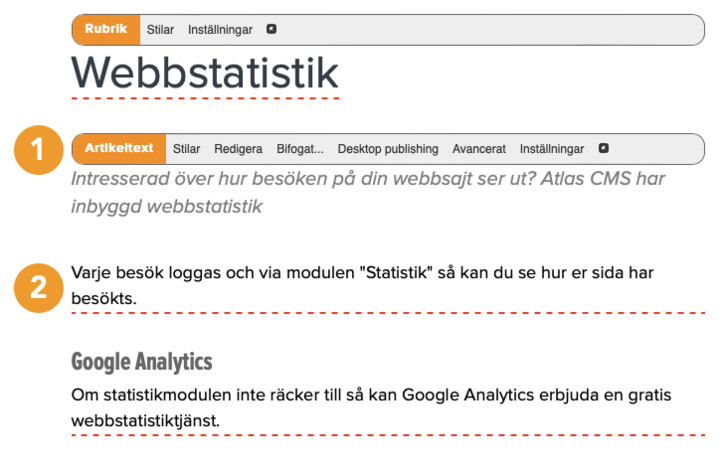 När text har en röd streckad markering under sid i adminläget så betyder det att du kan redigera texten direkt på sidan. När du klickar någon annan stans så kommer det upp en liten markering att det du har skrivit har sparats. För säkerhets skull så kan du ladda om sidan och se att det ser ut som du har tänkt dig. Den här funktionen är tänkt att användas för att redigera korta texter eller felstavningar, inte hela artiklar. Lite beroende på webbläsare så kan resultatet bli oväntat och då får du gå tillbaka och redigera innehållet den mer traditionella vägen