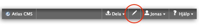 Adminläget i Atlas når du via den lilla pennan i botten på sidan, vilket i sin tur visar de olika adminkontrollerna för de moduler som finns på sidan.