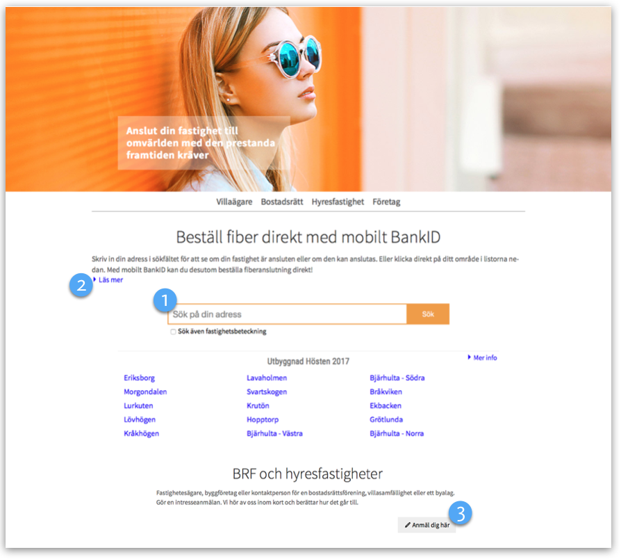 Besökaren skriver in sin adress och klickar på Sök. Då görs en sökning först i Marknadsdatabasen och, om adressen inte hittas gör en ytterligare sökning i Anslutamotorns adressdatabas. Beroende på sökresultatet ges besökaren olika besked och kan antingen uppmanas att beställa en tjänst eller göra en intresseanmälan.