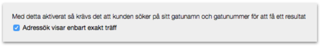 Detta ställer högre krav på kund, därför rekommenderar vi att ni, om ni tänker använda funktionen, informerar om detta i texten ovanför adressökningen. T.ex: Sökformat: Exempelgatan 123 A. (Klicka på pennan för redigeringsläge, sen på skiftnyckeln i grå verktygsfältet Sök), sen kan ni redigera texten i fältet text.