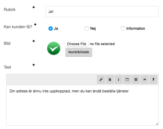 Tidigare fanns det en global inställning i Tjänsteguidens inställningar var "Okänt" status betydde, som till exempel om en kund söker på sin adress och Marknadsdatabasen inte har information om kundens porthastighet, om det fanns en CPE eller om TV kan levereras så är status "okänt" och standardinställningen är att tillåta beställning även om status är okänt men med den globala inställningen kunde man ändra det till att "okänt" inte tillät beställning, nu kan man bestämma det per separat "okänt"-svar i MeddelandefunktionenAnvänd AdminTjänsteguidenMeddelanden för att redigera meddelanden för "Internet: Ingen kapacitetsinformation i databasen", "Telefoni: Ingen CPE-information i databasen", "TV: Ingen TV-information i databasen" samt "Datum för anslutning är i framtiden" för att avgöra hurivida någon av dem tillåter eller inte tillåter beställning i Tjänsteguiden.