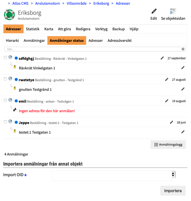 Så då kan ni använda en importfunktion som ni hittar inne på området. Ni går in på "Bäckby" i det här fallet och klickar på adressfliken och sedan på anmälningar-fliken. Där finns en importfunktion för anmälningar från andra områden. Välj område i listan eller skriv in OID själv (om ni redan tagit bort objektet så finns det inte med i listan). Sedan trycker ni på "importera".