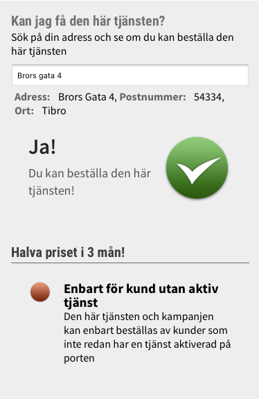 På tjänstebeskrivningen när man fyller i sin adress under "Kan jag få den här tjänsten" så kan det betyda att man får två svar dock, för själva tjänsten i sig uppfyller alla tekniska krav, men det följer med information om att man inte kan aktivera den med en av kampanjerna på tjänsten.