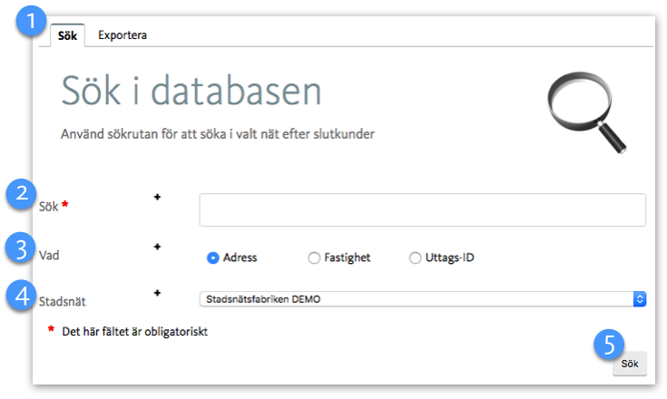 Via Marknadsdatabasens användargränssnitt på Stadsnätsportalen är det möljigt att söka på enskilda adresser eller exportera listor med data från ett eller flera stadsnät