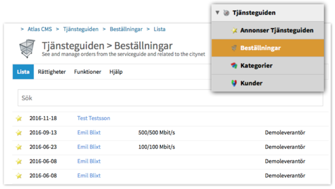 Klicka på Atlas CMS för att komma till listan med moduler eller gå till er Tjänsteguide och klicka på länken nere i adminlisten. Klicka därefter på Tjänsteguiden i listan för att öppna modulens funktioner i högerspalten och för att fälla ut undermoduler.