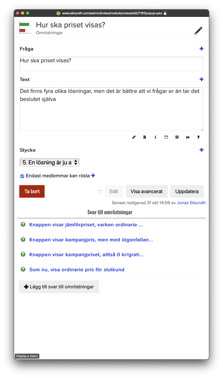I admin-läget så klickar du på "Bifogat..." och sedan på Omröstningar. Då får du upp en lista över de omröstningar som ligger inne och kan skapa nya. Knyt dem till ett stycke och sätt ett namn och beskrivning på frågan. Du kan också bestämma att enbart inloggade medlemmar kan rösta.