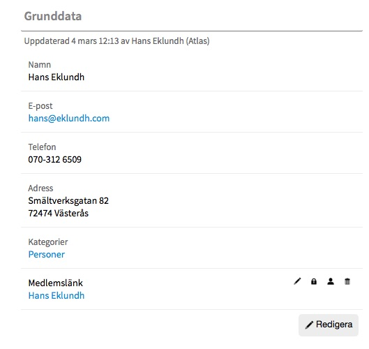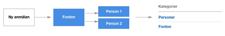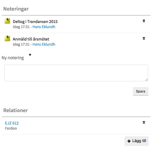 Dessutom finns möjighet att föra noteringar såväl till fordonet som personerna. Dessa är bara synliga för inloggade administratörer. Under rubriken Relationer visas kopplingen mellan fordon och personer.