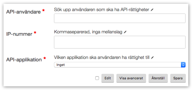 Gå till AdminAnvändareAPI-rättigheter och klicka på "Lägg till" eller välj den funktion som du vill skapa en användare för. Välj sedan vilken användare som ska ha rättigheter, vilka IP-nummer som den användaren kommer ansluta från och sedan vilket API (om det inte redan är förvalt).