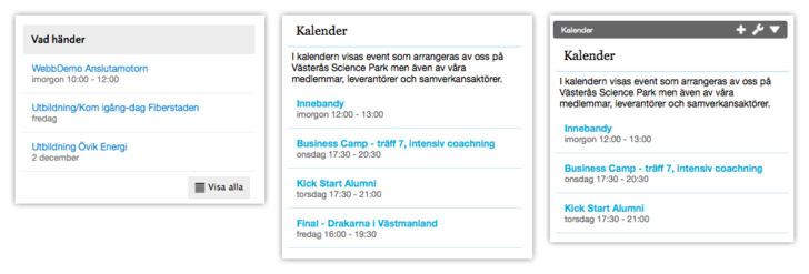 Kalendern är en funktion som presenterar evenemang och aktiviteter på ett smart sätt. Kalendern består dels av en löpsedelsvy på till exempel webbens förstasida och en bakomliggande presentationsartikel som man når genom att klicka på ett objekt i Kalendern. Båda vyerna genereras ur samma datapost.