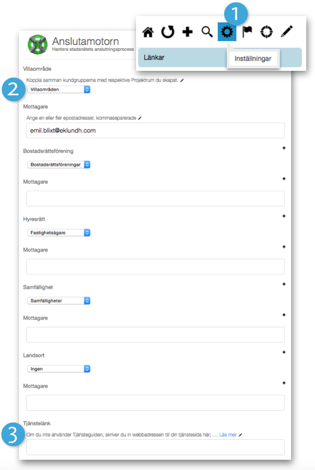 i Atlas CMS > Anslutamotorn > Inställningar knyter du ihop de olika kundkategorierna med de projektrum du skapat. Du kan också här ange en alternativ URL om du inte använder Tjänsteguiden.