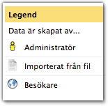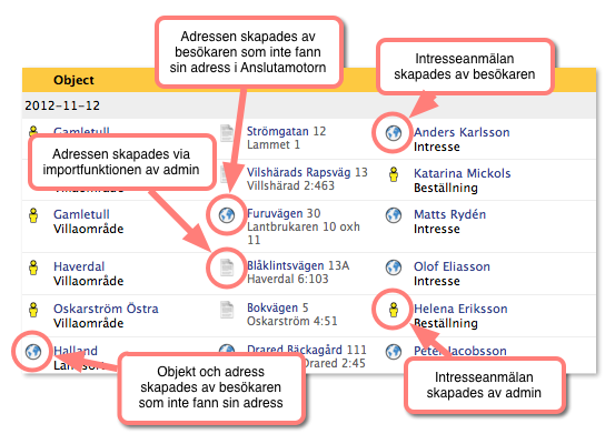 I adresslistan inne på ett område ser man också om en address och dess anmälningar kommer från import, admin eller besökaren med hjälp av ikoner