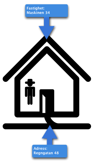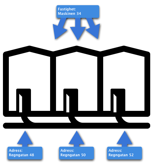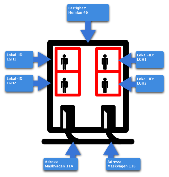 Den unika nyckeln skapas av Fastighetsbeteckning, Gatunamn, Gatunummer, Gatubokstav och Lägenhetsnummer, vilket betyder att antalet anmälningsbara objekt blir varje lägenhet i ett område. Detta är standard för hyresrätter och bostadsrätter. I bilden till höger så har vi en fastighet med två adresser och två lägenheter på varje. Totalt så har vi alltså fyra stycken anmäläningsbara objekt