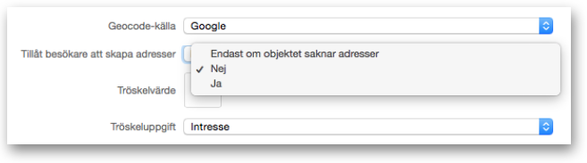 I anslutamotorn>inställningar väljer ni Ja i fältet: "Tillåt att besökare skapar adresser". Om ni inte vill tillåta besökare skapa objekt (villaområde, brf, hyresfastighet, o.s.v.) väljer ni Nej i fältet: "Tillåt att besökare skapar objekt". Väljer ni Ja kan besökaren skapa ett nytt objekt för sin adress eller välja ett befintligt som inte är låst.