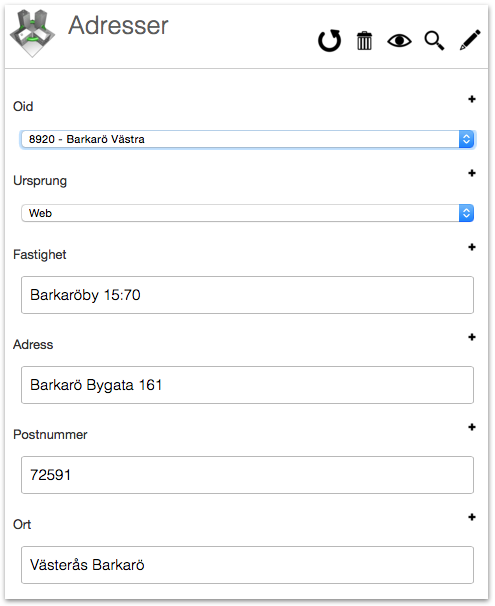 Om adressen är på fel område så klickar du på pennan för den adressen och väljer ett nytt objekt under fältet "OID", alla anmälningar kopplade till den adressen följer då med automatiskt till det nya objektet. Detta är användbart om adresser har lagts till i ett område på grund av att besökaren skapat en intresseanmälan på en adress ni inte hade lagt upp och vill behandla separat från det övriga objektet.