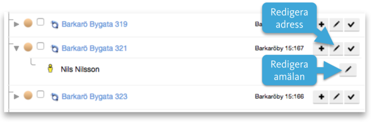 Om ni däremot fått in en anmälan på en adress som är felaktig. Kanske fel gatunamn, fel gatunummer eller kanske till och med helt fel objekt - ni kan ju ha "Påskvägen 24" på två olika objekt med två olika postnummer, och anmälan kom in på fel adress helt enkelt, eller om admin råkat skapa en anmälan på fel adress. Då klickar ni på pennan för anmälan och redigerar i formuläret. Om ni väljer ett nytt objekt så töms adressinformationen, men menyn till höger om fastighetsbeteckningen innehåller en bruttolista över alla adresser i det objekt du valt. När du väljer en adress där så fylls alla fält i korrekt enligt vald information.