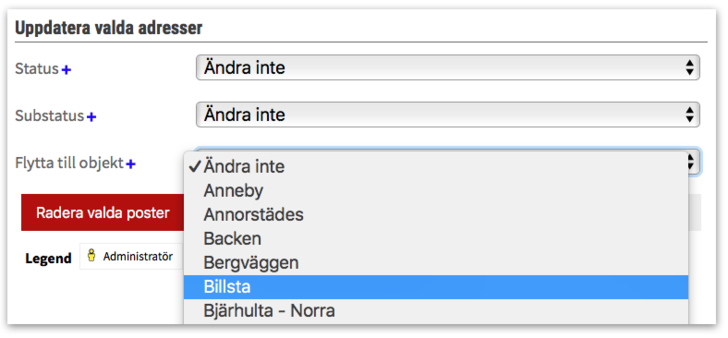 Gå in på adminsidan för aktuellt område och markera de adresser som ska flyttas