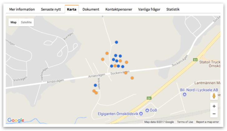 Visar en Google Map-karta över området som dynamisk markerar inkommna anmälningar och avtal med en flagga. Geokodningen (som gör om en adress till en longitud/latitud) görs automatiskt av Google och vi tar inget ansvar för eventuella felplaceringar av adresser på kartan eller för adresser som Google inte finner. Om Google inte hittar adresser eller placerar dem felaktigt kan du för det området ändra Geocode-källa från Google till Eniro (kartan kommer fortfarande att vara Google men koordinaterna hämtas från Eniro) eller redigera dem manuellt: