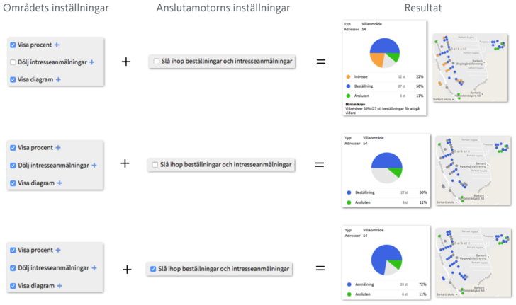 - Slå ihop beställningar och intresseanmälningar Lägger ihop beställningar och intresseanmälningar i statistiken på områden där intresse är dolt. Påverkar även automatiska kartan och status i resultat vid adressök. Se bild nedan