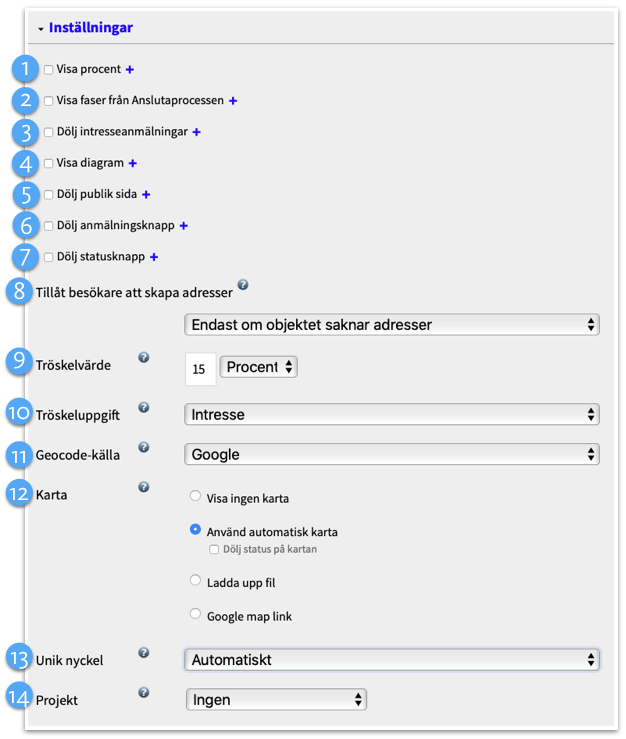 - Visa diagram. Här väljer ni om ni vill visa ett pajdiagram med statusar på området. (Hur stor andel intresseanmälningar, beställa och anslutna.)