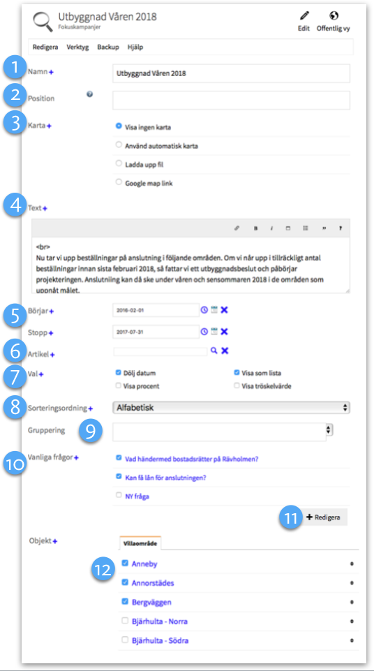 - Vanliga frågor De frågor ni klickar i här ärvs ner till fokuskampanjens alla områden och deras områdessidor