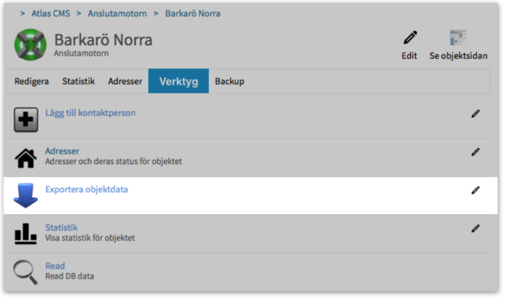 Altas CMS > Anslutamotorn Klicka t.ex. på mappen villaområden. Knappen Exportera objektdata ligger under kartan.