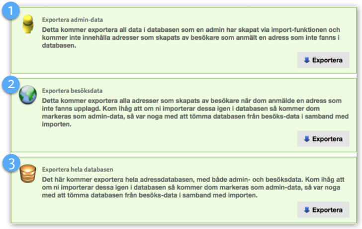 - Exportera admindata. Detta gör en export av adresser skapade/importerade av admin. Ev. besökarskapade adresser fäljer inte med