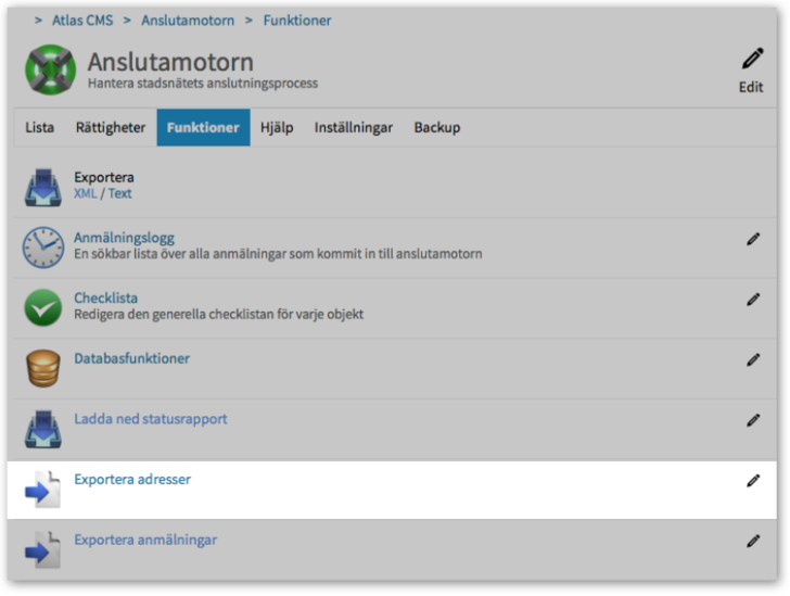 Vill ni göra förändringar på ett större antal adresser är det enklast att exportera ut adresser och göra ändringarna i t.ex. excel. När ni sedan återimporterar den ändrade adressfilen uppdateras aktuella adressrader i Anslutamotorn. Tänk på att vissa förändringar kan göra att anmälan tappar koppling till adressen, ni kan då använda funktionen