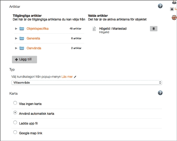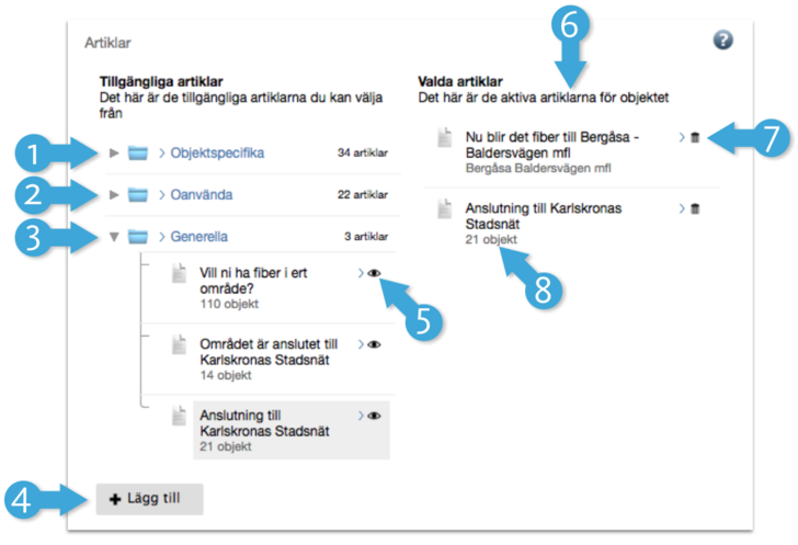 - Objektsspecifika artiklar. Här hittar du alla artiklar som endast används på en områdessida.