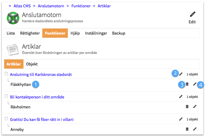 Under Atlas CMS > Anslutamotorn > Funktioner > Artiklar kan ni se vilka artiklar som används och på vilka områdessidor