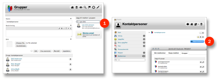 - Klicka på den nya användargruppen efter att du skapat den. Du kan nu söka upp och lägga till alla kontaktpersoner du registrerat. Här finns också en funktion för att skicka ett gruppmail till alla i gruppen.