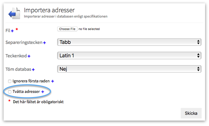 Den här funktionen städar och normaliserar adresser i både adress- och anmälningsdatabasen och tar bort inledande och avslutande mellanslag. Dessutom görs alla versaler om till gemener (utom första bokstaven).
