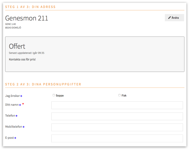 Nu kan ni i prisfältet (price) på en adress skriva in valfritt ord, t.ex. ejbeställning, istället för ett avvikande pris. Detta tar bort beställningsdelen i anmälningsformuläret och kund kan endast göra intresseanmälan (om ni tillåter det).