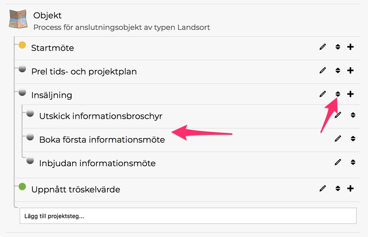Varje processteg kan innehålla ett antal underaktiviteter. Klicka på + (plusikonen) till höger för att skapa understeg. Dessa kan då aktiveras per område eller inte. Nya understeg kan även skapas lokalt på objekt, adress eller anmälan.