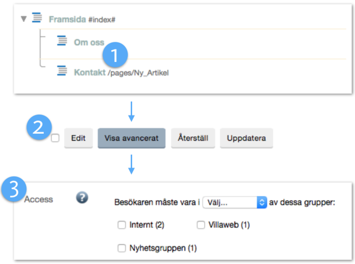 Om ni vill att en sida endast ska visas för medlemmar i en eller flera grupper gör ni följande:
