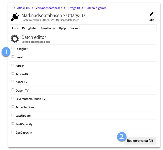 För att batchredigera urval/sökresultat - t.ex. alla uttag på en specifik adress/fastighetsbeteckning - klicka på / sök efter en adress eller fastighet > klicka på aktuell adress/fastighet > klicka sen på fliken Verktyg > Alla adresser eller Alla uttagsID. Nu kan du markera de adresser/uttagsID:n som ska redigeras och sen scrolla ner och klicka på Redigera valda poster och välj sedan fält enligt ovan.
