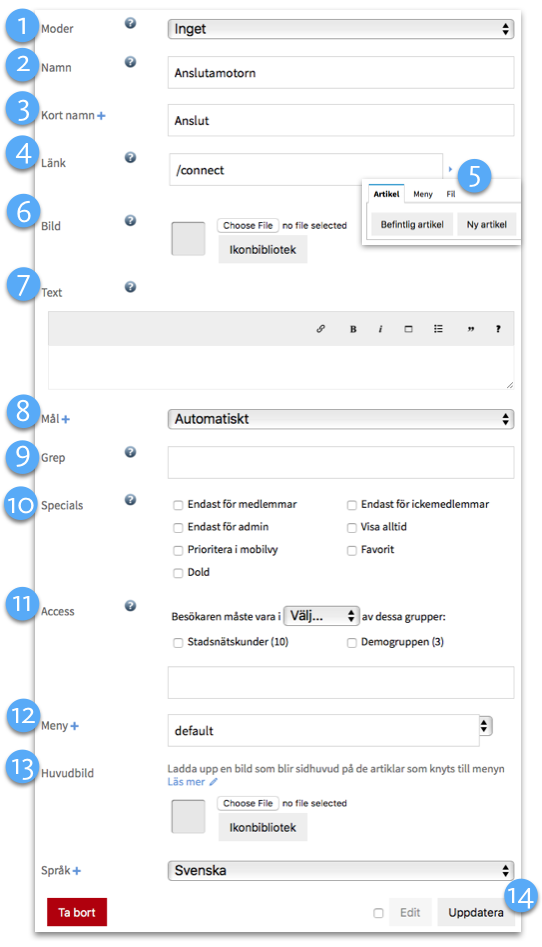 - Välj befintlig artikel/meny/fil eller skapa ny