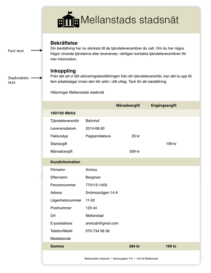 Om stadsnätet vill ha en kopia på beställningen så fyll i aktuella epostadresser i Tjänsteguiden > Inställningar. Där kan också stadsnätet lägga till en hälsningstext till kunden som adderas i beställningsbekräftelsen (se Inställningar).