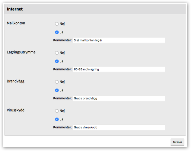 Har ni valt kategori Internet för tjänsten visas Internetspecifika val under tjänstebeskrivningen. Här anger du om Mailkonton, Lagringsutrymme, Brandvägg och Virusskydd ingår.