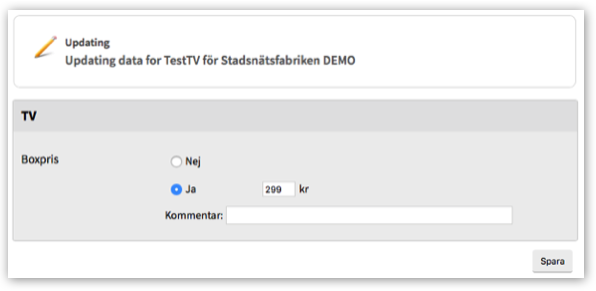 Har du valt kategori TV för tjänsten visas TV-specifika val under tjänstebeskrivningen, t.ex. Kort- och Box-priser samt vilka kanaler som ska ingå.