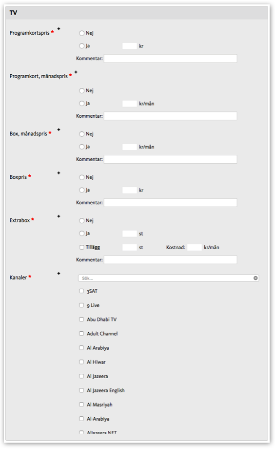 - Om TV-tjänst: Ange om tjänsten är TV-plattform, Grundpaket eller Tillvalspaket