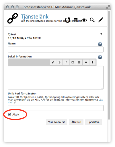 Om en tjänst som finns i din Tjänsteguide inte ska visas av någon anledning, öppnar du formuläret för tjänsten och tar bort krysset i Aktiv.