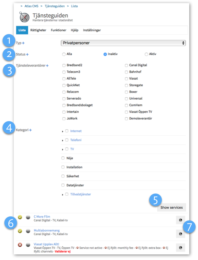 - Här visas lista med tjänster (resultat av filtrering) Gör ni ingen filtrering visas alla inaktiva tjänster