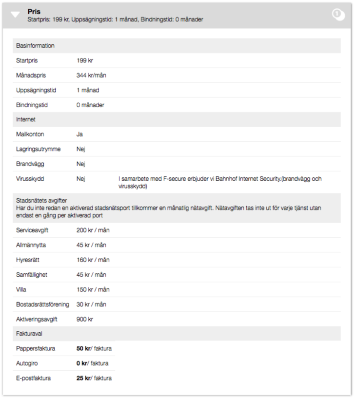 Bilden nedan visar avgifter du angett i avgiftsmodulen som de visas under Pris i tjänstebeskrivningen.
