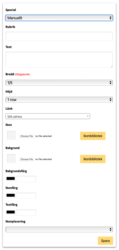 - Special. Välj typ av platta bland alternativen eller ang Manuellt för att anpassa själv, t.ex. om plattan ska länka till en specifik tjänstekategori