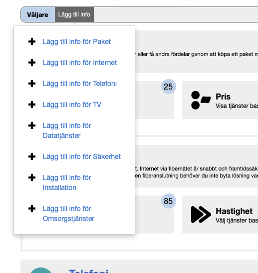 Som standard visa tjänsteväljaren alla kategorier som ni har tjänster i, med ikon, beskrivning och standardlänkar för att visa tjänsterna. Om kategorin har mer än 20 tjänster så visas det även en prisväljare. För internet- och tv-kategoring visas även knappar för hastighet och tv-typ.
