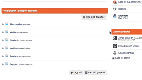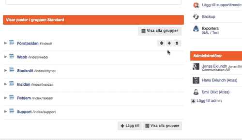 För att ändra ordningen på poster i databasen så använder du den lilla "flytt-ikonen" på varje rad i de moduler som tillåter sortering.