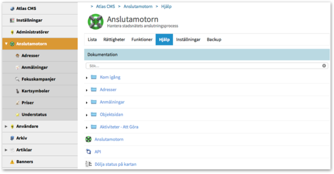 Under fliken Hjälp har vi samlat all dokumentation och alla updates som rör Anslutamotorn. Du kan fortfarande klicka på Hjälp-länken längst ner till höger i Adminlisten, och får då en popup-lista med alla moduler. Välj aktuell modul och en dokumentationsartikel så visas denna i ett nytt fönster. Ett bra alternativ när man inte vill klicka bort sig från sidan man jobbar på.