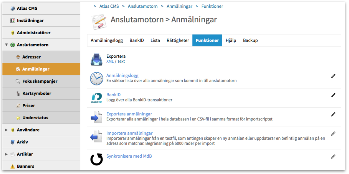 Under fliken Funktioner i anmälningsmodulen hittar du bl.a. Export och Import av anmälningar och Synkronisera med MdB