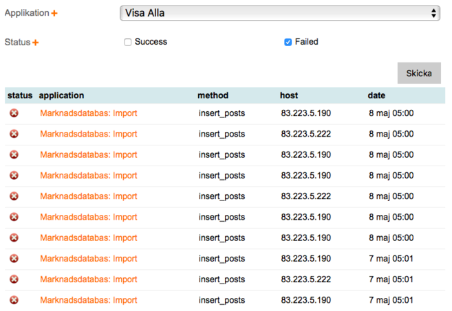 På sistone har vi fått in en hel del supportärenden vad gäller API:erna och när vi felsöker API:erna så kollar vi i vår API-log, men det känns dumt att den loggen ska vara tillgänglig enbart för oss, så därför har vi nu implementerat en ny funktion som ni hittar i API-rättigheter modulen under AdminAnvändareAPI-rättigheterFunktionLog och där ser ni de senaste API-transaktionerna (vi sparar upp till en månad innan dom tas bort)