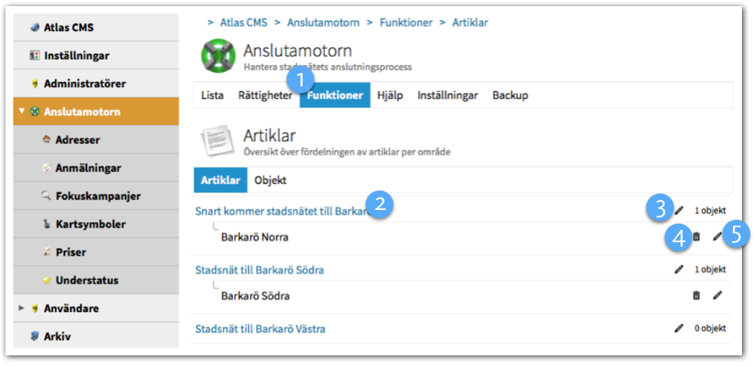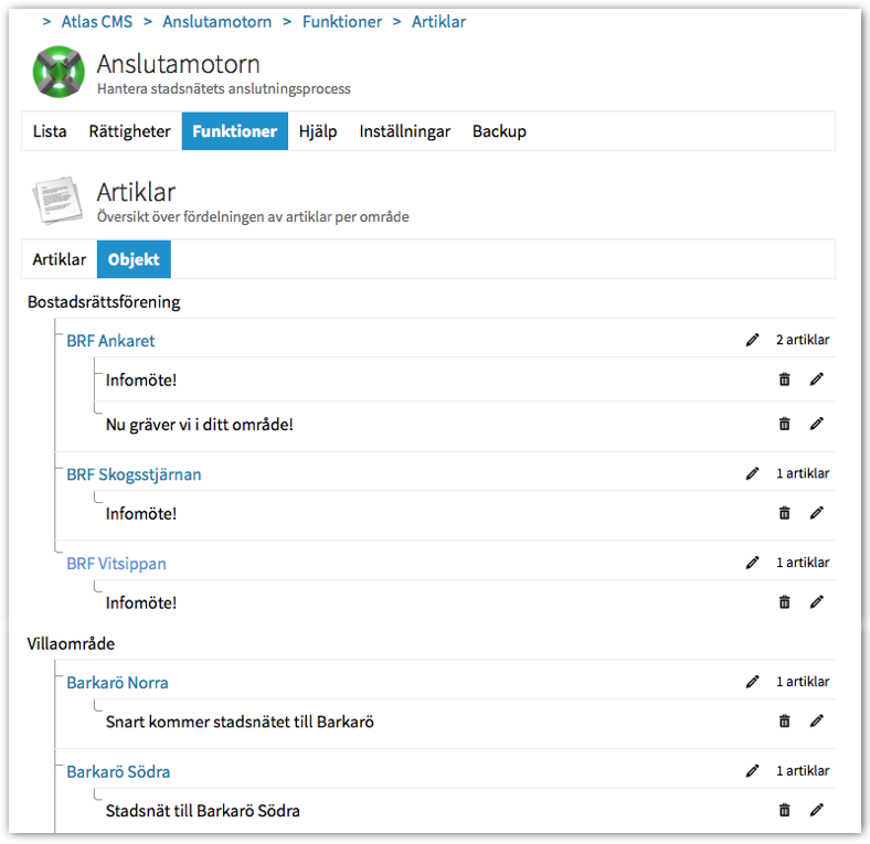 Under Anslutamotorn > Funktioner > Artiklar finns nu en översikt över de artiklar som används på Anslutamotorns områdessidor. Under första fliken visas alla områdesartiklar och vilka områden dessa ligger på. Här visas även oanvända artiklar.